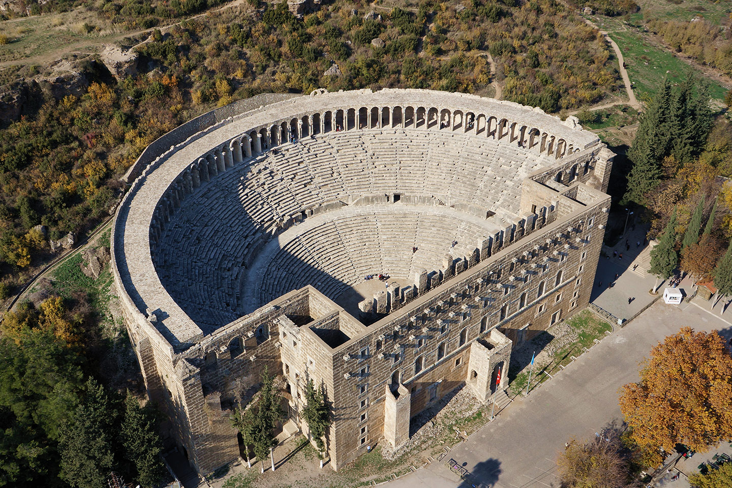 Roman amphitheater in Aspendos aerial view, Belkis, Antalya, Turkey